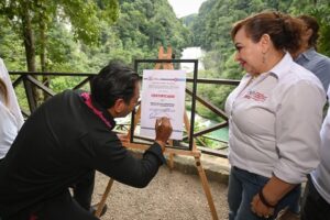 Agregó que esta declaratoria es resultado del compromiso de las comunidades y autoridades ejidales, y que beneficiará directamente a más de 200 familias, además de fortalecer el desarrollo regional. Explicó que esta reserva forma parte del conjunto de reservas de los mil años, iniciativa orientada a salvaguardar los paisajes más valiosos del estado. “Desde aquí, donde el agua canta y la selva resiste, proteger el medio ambiente es un llamado a la conciencia ecológica y al humanismo que transforma”, comentó.